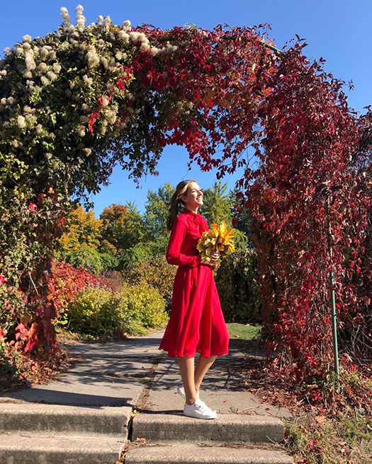Она сфотографировалась в ярком красном платье с длинными рукавом и бантом на шее. Звезда дополнила образ белыми кроссовками.