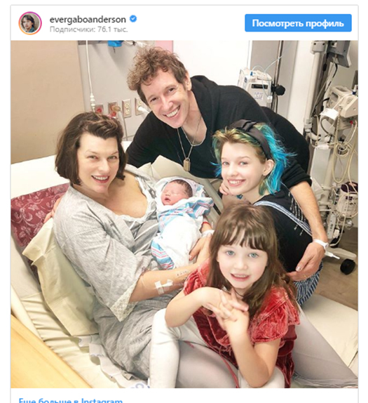 О рождении девочки сообщила 12-летняя дочь Йовович своей странице в Инстаграм.