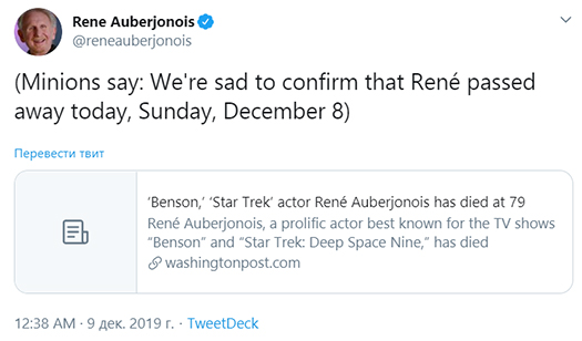 Стало известно, что на 80-м году жизни умер актер и режиссер Рене Обержонуа. Об этом сообщается в Twitter артиста, передает Newformat.info.