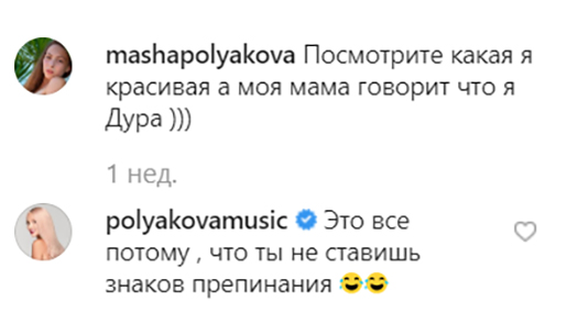 В разговор вмешалась сама Оля Полякова и ответила: “Это все потому, что ты не ставишь знаков препинания!”.