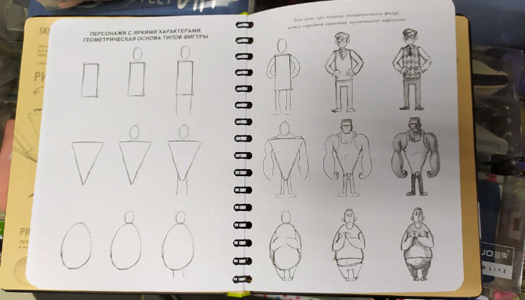 В скетчбуке пошагово показан процесс создания как простых рисунков и базовых фигур, так и более сложных объектов окружающего мира.
