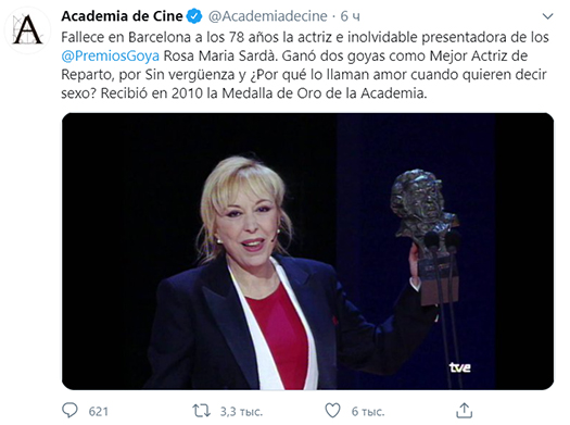 На 79-м году жизни в Барселоне скончалась известная испанская актриса и театральный режиссер Роса Мария Сарда. Об этом сообщила в Twitter Испанская академия кинематографических искусств и наук, передает Newformat.info.