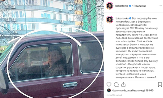 “Вот посоветуйте мне пожалуйста, как с бороться с человеком, который тебя проследует? Почему по нашему законодательству нельзя предпринять какие-то меры до тех пор, пока он ничего не сделает мне или моим детям. Этот человек психически болен и лечился не один раз в специализированных клиниках! Он ездит за мной по концертам, караулит меня и моих детей под домом и что в его больной голове только ему одному известно. Он достаёт меня в соцсетях, угрожает и пишет чушь”, – призналась она в соцсети.