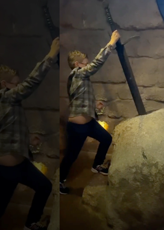 Мать и сын побывали в одном из заведении в стиле Средневековья. Вениамин искал драконов в заведении и играл с железным мечом, который вытащил из камня.