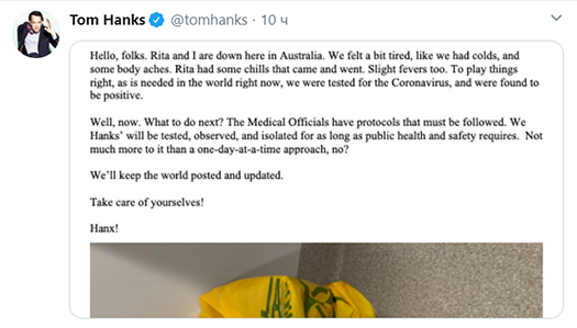 Актер сообщил, что пребывая в Австралии, он и его жена почувствовали себя плохо. Недомогание было с симптомами COVID-2019 симптомами. Том Хэнкс и его жена Рита сдали анализы, которые показали положительный результат.Теперь звездной паре предстоит провести необходимое время на карантине и пройти обследование.