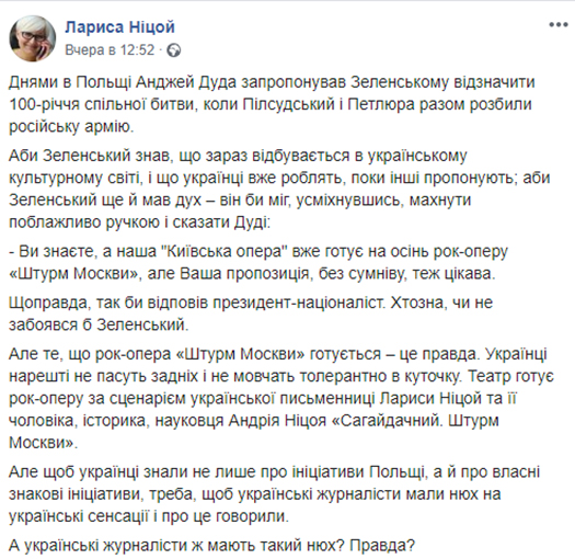 Украинская писательница Лариса Ницой сообщила о готовящейся премьере рок-оперы «Сагайдачный. Штурм Москвы».