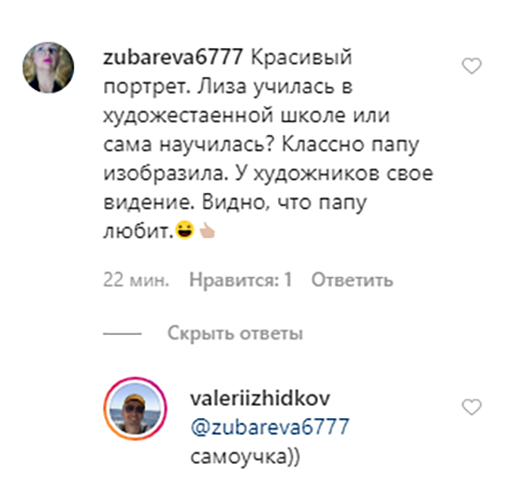 Поклонники поздравляют Валерия Жидкова с Днем рождения и восхищаются талантом его дочери: “Днем Рождения! Процветания, мира, добра, любви! Лиза – талант!”, “С Днём рождения поздравляем! Будьте таким же позитивным, спасибо за ваше невероятное и неповторимое чувство юмора. Семейного счастья вам, здоровья и благополучия”, “С Днём Рождения! Приумножения мудрости и творческих взлётов все выше и выше!”.