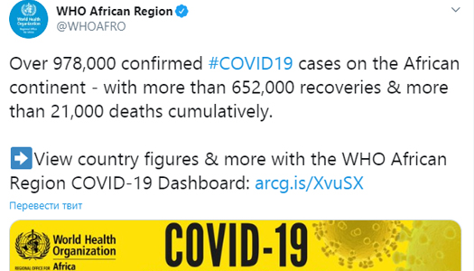 Представительство Всемирной организации здравоохранения (ВОЗ) в Африке сообщило, что число выявленных случаев коронавирусной инфекции COVID-19 в регионе достигло 978 481.