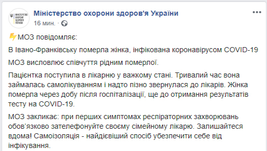 МОЗ повідомляє, що в Івано-Франківську померла жінка, інфікована коронавірусом COVID-19. Пацієнтка поступила в лікарню у важкому стані. Тривалий час вона займалась самолікуванням і надто пізно звернулася до лікарів. Жінка померла через добу після госпіталізації, ще до отримання результатів тесту на COVID-19.