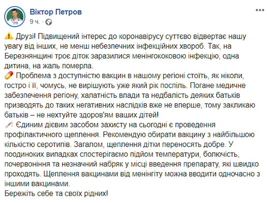 “На Великоберезнянщине трое детей заразились менингококковой инфекции. Один ребенок, к сожалению, умер”, – написал он.