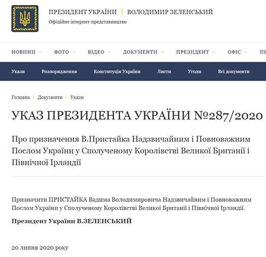 «Назначить Пристайко Вадима Владимировича чрезвычайным и полномочным послом Украины в Соединённом Королевстве Великобритании и Северной Ирландии», — говорится в документе.