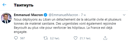 Президент Франции Эммануэль Макрон в своем Twitter написал, что в Ливан будет отправлен отряд сил гражданской обороны и несколько тонн санитарно-медицинских принадлежностей.