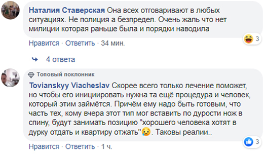 Пользователи Сети отреагировали на пост. Одни выражают недоверие полиции, другие считают, что человека, который нападет на людей с ножом на улицах надо лечить.