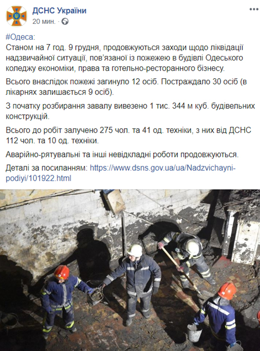 Продовжуються заходи щодо ліквідації надзвичайної ситуації, пов’язаної із пожежею в будівлі Одеського коледжу економіки, права та готельно-ресторанного бізнесу, повідомляє прес-служба ДСНС України.