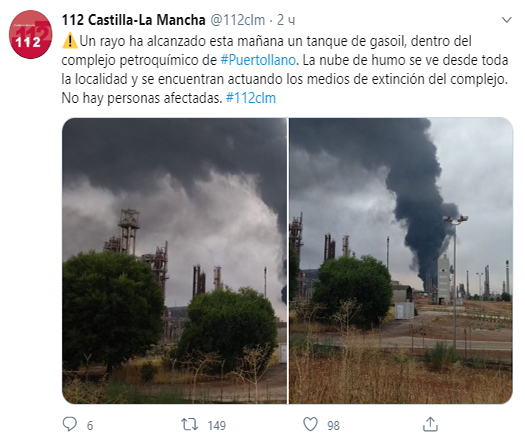 Молния ударила в резервуар с дизельным топливом внутри нефтехимического комплекса, который находится в муниципалитете Пуэртольяно (провинция Сьюдад-Реаль, автономное сообщество Кастилия-ла-Манча). По данным пожарной службы, резервуар принадлежит испанской нефтегазовой компании Repsol.