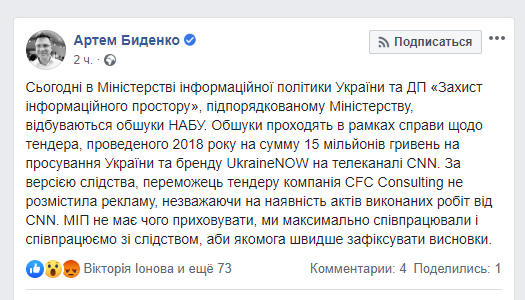 “Обшуки проходять в рамках справи про тендер, проведений в 2018 році на суму 15 млн грн на просування України та бренду UkraineNOW на телеканалі CNN, – написав він.