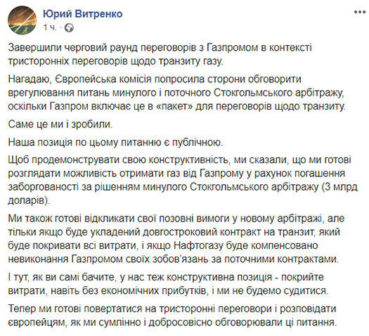 “Завершили черговий раунд переговорів з Газпромом в контексті тристоронніх переговорів щодо транзиту газу. Нагадаю, Європейська комісія попросила сторони обговорити врегулювання питань минулого і поточного Стокгольмського арбітражу, оскільки Газпром включає це в «пакет» для переговорів щодо транзиту. Саме це ми і зробили. Наша позиція по цьому питанню є публічною. Щоб продемонструвати свою конструктивність, ми сказали, що ми готові розглядати можливість отримати газ від Газпрому у рахунок погашення заборгованості за рішенням минулого Стокгольмського арбітражу (3 млрд доларів). Ми також готові відкликати свої позовні вимоги у новому арбітражі, але тільки якщо буде укладений довгостроковий контракт на транзит, який буде покривати всі витрати, і якщо Нафтогазу буде компенсовано невиконання Газпромом своїх зобов’язань за поточними контрактами. І тут, як ви самі бачите, у нас теж конструктивна позиція – покрийте витрати, навіть без економічних прибутків, і ми не будемо судитися. Тепер ми готові повертатися на тристоронні переговори і розповідати європейцям, як ми сумлінно і добросовісно обговорювали ці питання”, – написав Юрий Вітренко.