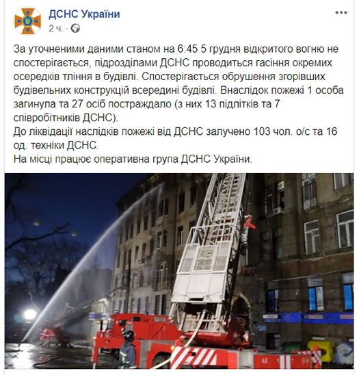 На официальной странице ГСЧС Украины в Facebook сообщается, что для ликвидации последствий пожара от ГСЧС было привлечено 103 чел. личного состава и 16 ед. техники. В результате этой страшной трагедии погиб один человек, 27 пострадало (из них 13 подростков и 7 работников ГСЧС).