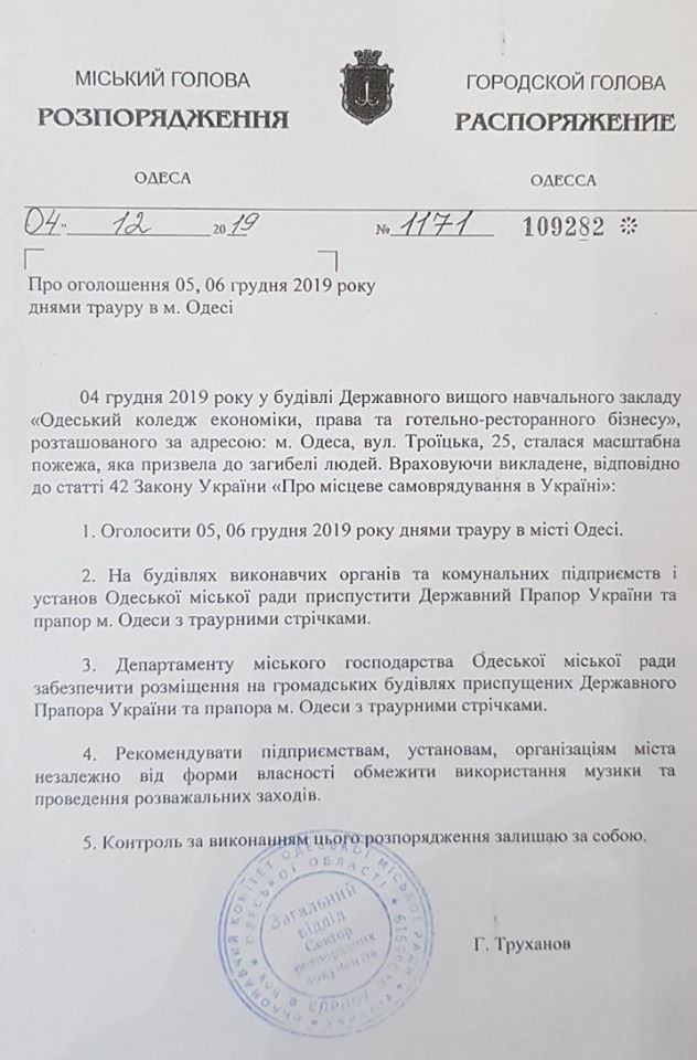 5 и 6 декабря объявлены в Одессе днями траура.