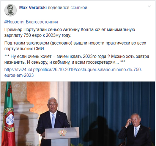 Премьер Португалии сеньор Антониу Кошта заявил, что к 2023- му году в стране должна быть минимальная зарплата размером в 750 евро.