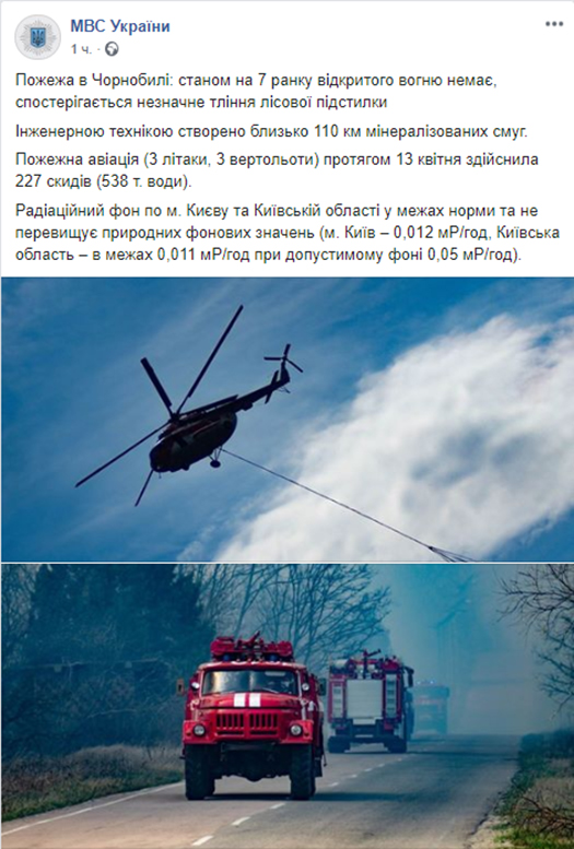 “Пожарная авиация (3 самолета, 3 вертолета) в течение 13 апреля осуществила 227 сбросов (538 т. воды). Радиационный фон по г. Киеву и Киевской области в пределах нормы и не превышает естественных фоновых значений (г.. Киев – 0,012 мР/час, Киевская область – в пределах 0,011 мР/час при допустимом фоне 0,05 мР/ч)”, – говорится в сообщении.