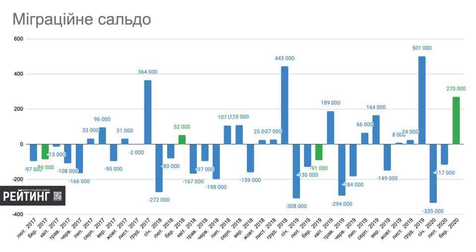 “Скільки українців повернулося з-за кордону під час коронавірусу? Ділюсь цифрами, які ми отримали через запит на прикордонну службу. У березні міграційне сальдо склало +270.000 українців (округлено). Для порівняння на графіку показано останні 4 роки (для зручності березень позначено зеленим). Це найбільше повернення українців за будь-який місяць за виключенням грудня, коли масове повернення має сезонний характер. Також звертає на себе увагу, що до вірусу амплітуда міграційного сальдо постійно зростала: у грудні повернення було найбільш масовим, у січні — найбільш масовий виїзд”, – написав він.