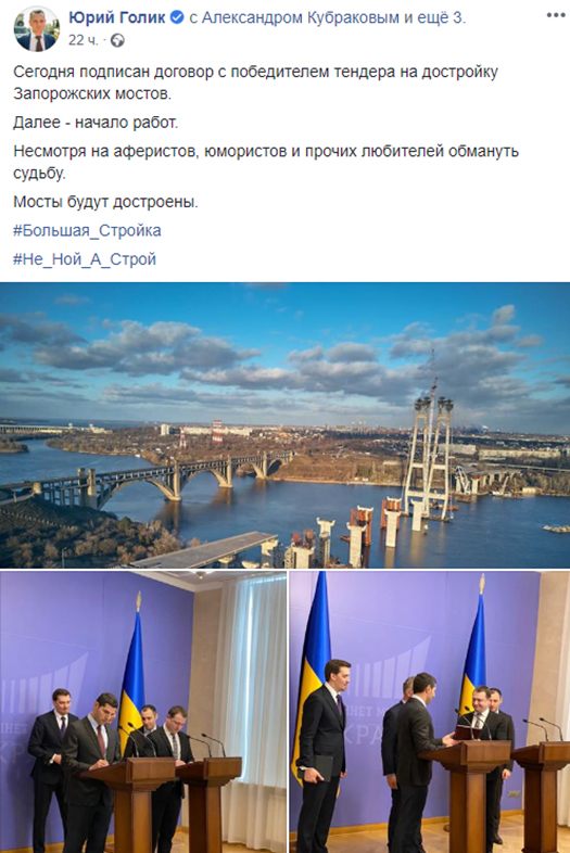 Новость о подписании контракта в Facebook сообщил советник премьер-министра Юрий Голик, который является координатором национальной инфраструктурной программы “Большая Стройка”.