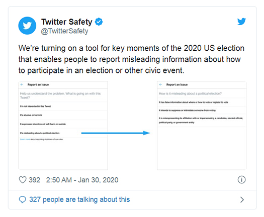 “Мы активируем инструмент для работы с ключевыми моментами в ходе выборов в США в 2020 году, который позволит людям сообщать о вводящей в заблуждение информации относительно участия в выборах или других гражданских событиях”, – сообщили в Twitter.