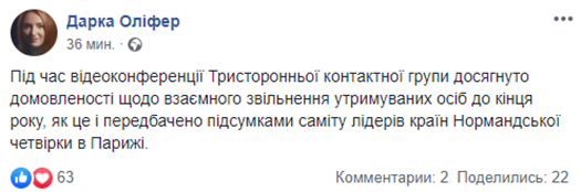 «Під час відеоконференції Тристоронньої контактної групи досягнуто домовленості щодо взаємного звільнення утримуваних осіб до кінця року, як це і передбачено підсумками саміту лідерів країн Нормандської четвірки в Парижі», — повідомила прессекретарка представника України в ТКГ Леоніда Кучми Дарка Оліфер.
