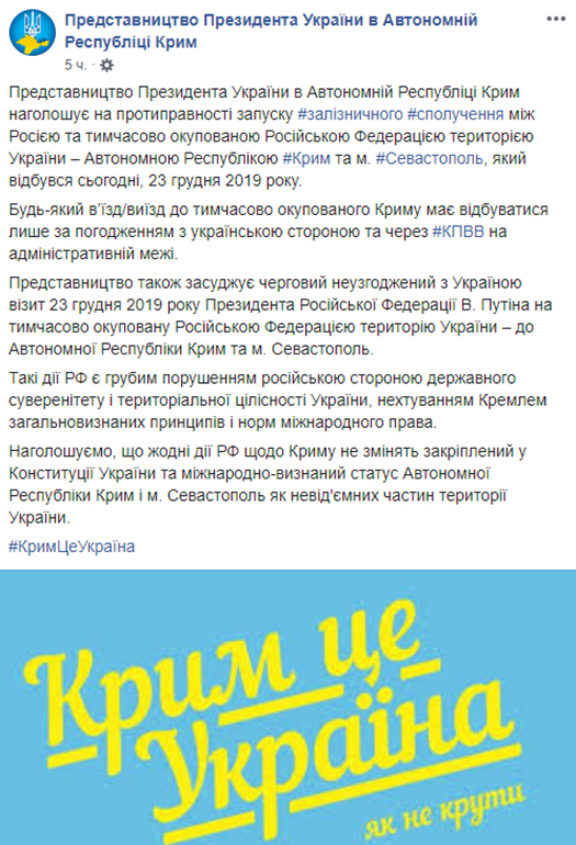 Представництво Президента України в Автономній Республіці Крим наголошує на протиправності запуску залізничного сполучення між Росією та тимчасово окупованою Російською Федерацією територією України – Автономною Республікою Крим та м. Севастополь, який відбувся сьогодні, 23 грудня.