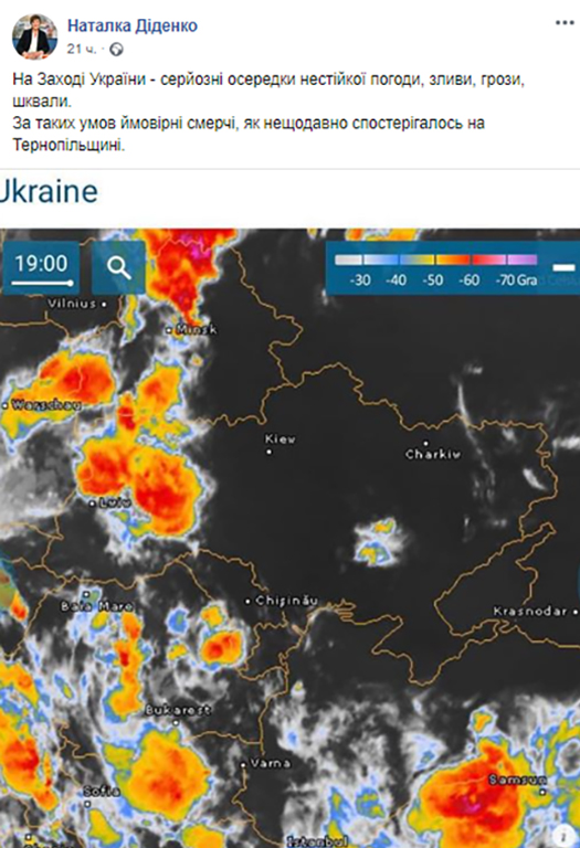 Кстати, синоптик Наталья Диденко на своей странице в Facebook предупредила украинцев о грозах, дождях и возможных торнадо, которые ожидаются в западной части страны.