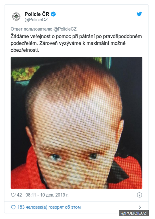 Чешская полиция в “Твиттере” попросила помощи в розыске подозреваемого и опубликовала его фотографию.