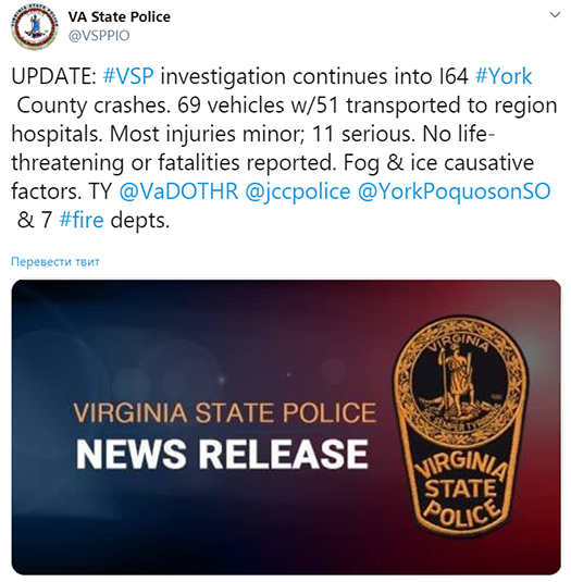 В американском штате Виргиния в результате массовой дорожной аварии с участием 69 автомобилей пострадали 51 человек.