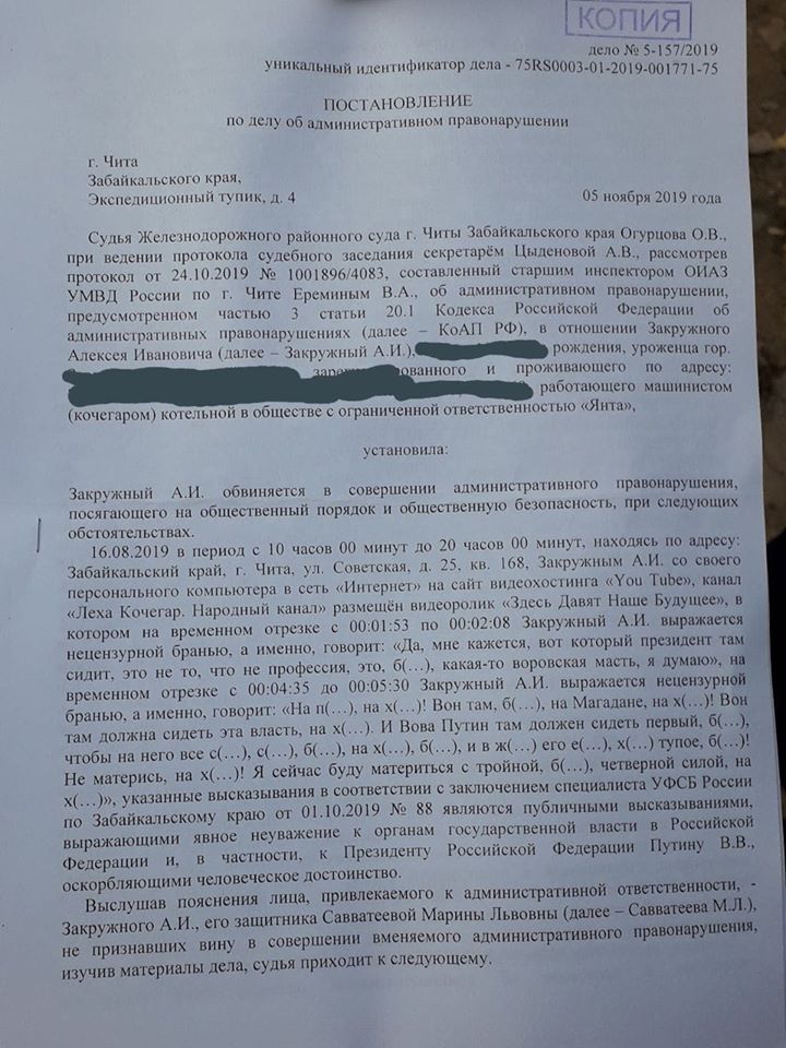 Российские CVB сообщают, что в Чите суд оштрафовал видеоблогера Леху Качегару (Алексея Закружного) на 30 тысяч рублей по статье об оскорблении власти (часть 3 статьи 20.1 КоАП РФ) после того, как в одном из роликов он сравнил должность президента Владимира Путина с «воровской мастью».