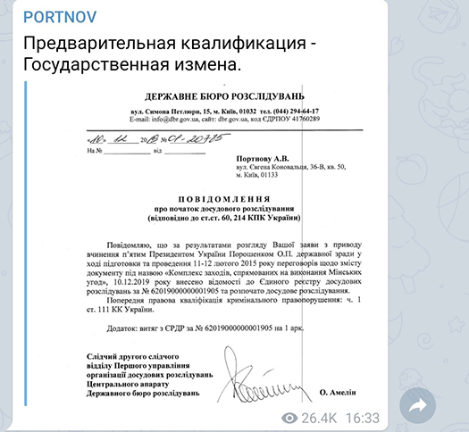 Заявление о госизмене Порошенко уже передал в ГБР юрист Андрей Портнов – главный инициатор дел против экс-президента.