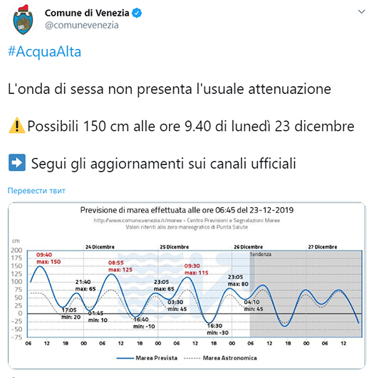 Как отмечают СМИ, в ноябре уровень «высокой воды» в Венеции достиг почти 190 см, что стало рекордным значением за последние 50 лет. Тогда, по подсчетам властей, городу был нанесен ущерб в размере €1 млрд.