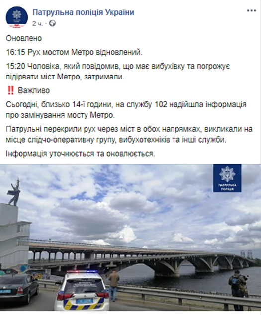 Сьогодні, близько 14-ї години, на службу 102 надійшла інформація про замінування мосту Метро в Києві. Патрульні перекрили рух через міст в обох напрямках, викликали на місце слідчо-оперативну групу, вибухотехніків та інші служби. О 15:20 “терориста” на мосту Метро затримали.