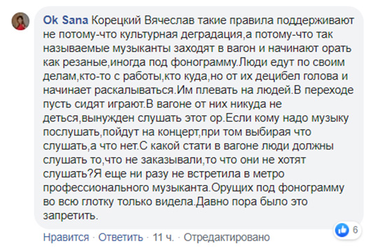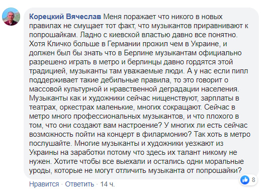 Вячеслав Корецкий в свою очередь возмущен, что якобы музыкантов приравнивают к попрошайкам: “Музыканты как и художники сейчас нищенствуют, зарплаты в театрах, оркестрах маленькие, многих сокращают. Сейчас в метро много профессиональных музыкантов, и что плохого в том, что они создают вам настроение? У многих ли есть сейчас возможность пойти на концерт в филармонию? Так хоть в метро послушайте. Многие музыканты и художники уезжают из Украины на заработки потому что здесь их талант никому не нужен. Хотите чтобы все выехали и остались одни моральные уроды, которые не могут отличить музыканта от попрошайки?”.