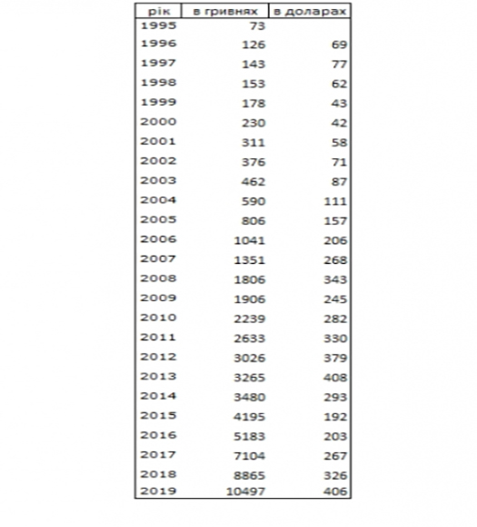 Таким чином, в доларах середня зарплата зросла в 5,9 рази – з 69 доларів 1996 року до 406 доларів в 2019 році.