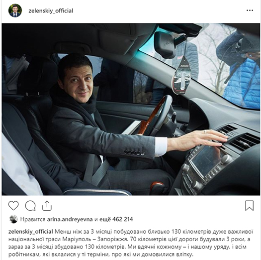 “Менш ніж за 3 місяці побудовано близько 130 кілометрів дуже важливої національної траси Маріуполь – Запоріжжя. 70 кілометрів цієї дороги будували 3 роки, а зараз за 3 місяці збудовано 130 кілометрів. Ми вдячні кожному – і нашому уряду, і всім робітникам, які вклалися у ті терміни, про які ми домовилися влітку.”, – написал он на своей официальной странице в Инстаграм.