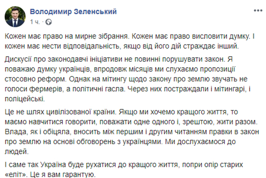 “Кожен має право на мирне зібрання. Кожен має право висловити думку. І кожен має нести відповідальність, якщо від його дій страждає інший. Дискусії про законодавчі ініціативи не повинні порушувати закон. Я поважаю думку українців, впродовж місяців ми слухаємо пропозиції стосовно реформ. Однак на мітингу щодо закону про землю звучать не голоси фермерів, а політичні гасла. Через них постраждали і мітингарі, і поліцейські”, – написав Зеленський у Facebook.