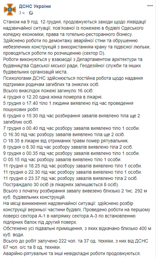 На месте трагедии были обнаружены тела 14 жертв. Еще двое скончались в больнице. Всего пострадавших – 30 человек. Восемь из них до сих пор остаются в больнице, сообщает ГСЧС Украины.