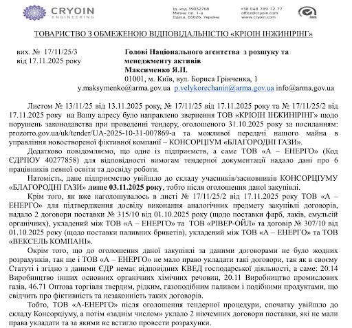 «Для того, щоб хоч якось відповідати вимогам тендерної документації за кількістю працівників, вже після публікації оголошення про проведення закупівлі до складу Консорціуму «Благородні Гази» 03.11.2025 року було прийнято ТОВ «А-ЕНЕРГІЯ», – повідомляється в одному із листів «Кріоін Інжинірінг», адресованих до АРМА.