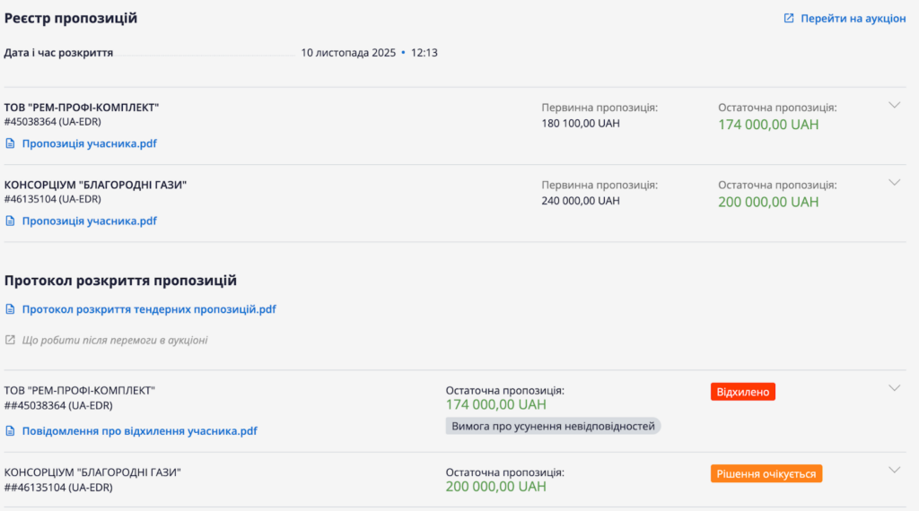 Кульмінацією схеми став тендер, оголошений 31 жовтня 2025 року. Його єдиним реальним претендентом є новостворений Консорціум “Благородні Гази”, який зареєстрований за 3 тижні до цього.
