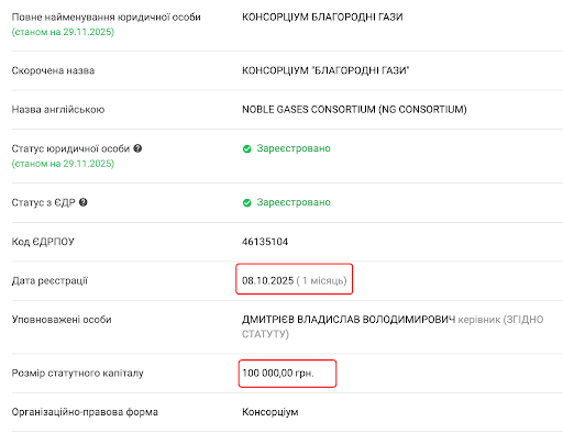 Консорціум було створено 8 жовтня 2025 року – лише за три тижні до оголошення тендеру. Жодне із підприємств-учасників консорціуму не має жодного досвіду у виробництві чи реалізації газів, виробництві газового обладнання чи управлінні майном таких масштабів.