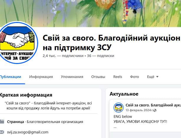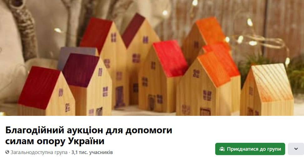 https://www.facebook.com/profile.php?id=61556623073124&locale=uk_UA – “Свій за свого” – благодійний інтернет-аукціон, всі кошти від продажу лотів йдуть на потреби армії.Один з прикладів аукціону де люди підтримують не тільки ЗСУ а й просувають українську культуру.