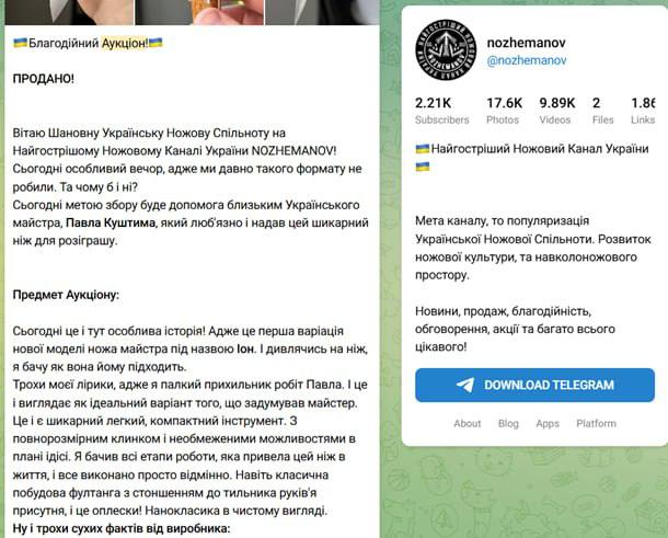 https://t.me/s/nozhemanov?q=%23%D0%B0%D1%83%D0%BA%D1%86%D1%96%D0%BE%D0%BD – Аукціони на даному каналі ,допомагають не тільки ЗСУ,а й різним сім’ям, які потребують допомоги.