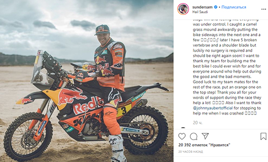 “К сожалению, моя гонка закончилась после аварии. Я боролся за победу на этапе и полагал, что все под контролем, но поймал колесом насыпь, несколько раз перевернулся и сломал пять позвонков и лопатку. К счастью, операция мне не потребуется, я скоро должен поправиться”, – написал мотогонщик.