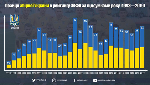 2019 рік збірна України завершила на 24-й позиції в рейтингу ФІФА, що є п’ятим результатом за всю історію нашої національної команди. Про це повідомляє пресслужба Української асоціації футболу.
